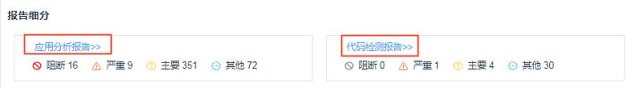 同时,也可以根据【报告细分】中【应用分析报告】和【代码检测报告】 去查看具体的检测缺陷以及解决方案。如下图:
