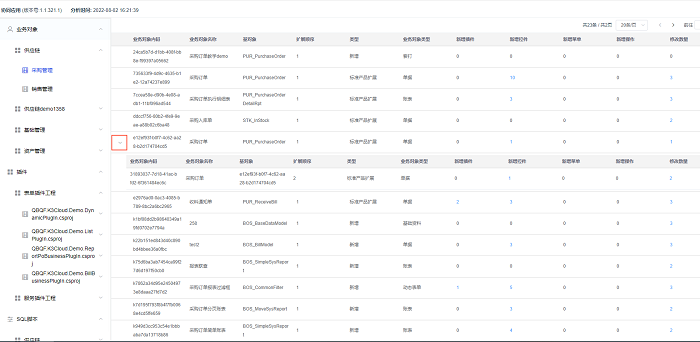 点击左侧表格下拉箭头会展示出对应的扩展,例如上图点击后出现采购订单的第二层扩展,可以根据扩展顺序判断是第几层扩展。