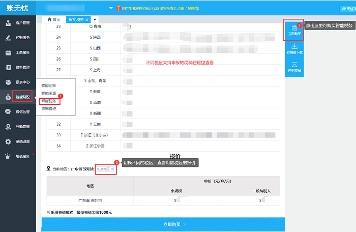 账无忧的报税功能是一项增值服务,需要额外充值后下载软件进行使用,请先查看对应地区是否有开放税种申报后在进行购买,请按下面的截图去查看对应的报价和购买的路径