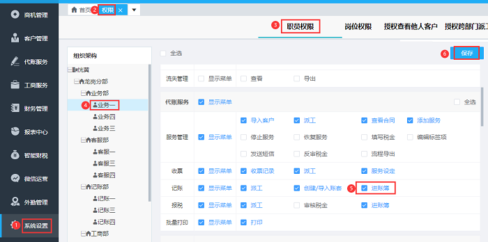 需要用管理员的账号,给对应职员勾选进账簿的权限,在【系统设置】 -- 【权限】下的职员权限,选择到具体需要设置权限的职员,勾选进账簿的权限后保存