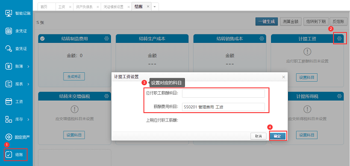 2.不使用工资模块通过【结账】界面计提工资,找到【计提工资】卡片点击右上角齿轮设置好对应科目