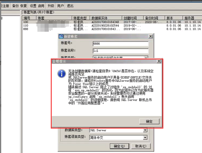 创建账套提示:无法创建数据库,请检查目录…错误描述:有关xp_cmdshell’启用状态。
