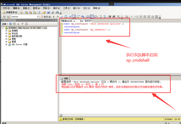 可以通过SQL脚本命令启用xp_cmdshell组件,详细步骤参考: