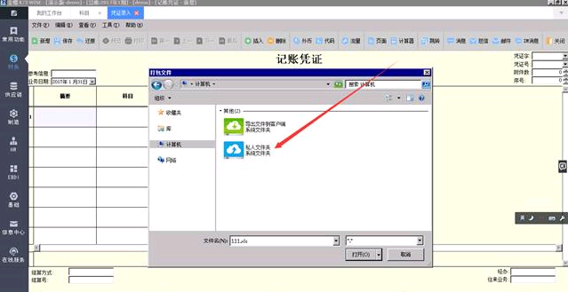 请注意,通过云盘上传文件的时候,请先用鼠标拖拽待上传的文件到打开金蝶程序上,然后松手;这个时候文件就会上传到服务器上的个人私人文件夹中。完成这一步之后,进行如下图操作: