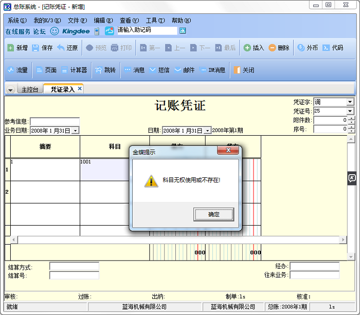 在金蝶软件录入凭证时提示“科目无权使用或不存在!”?