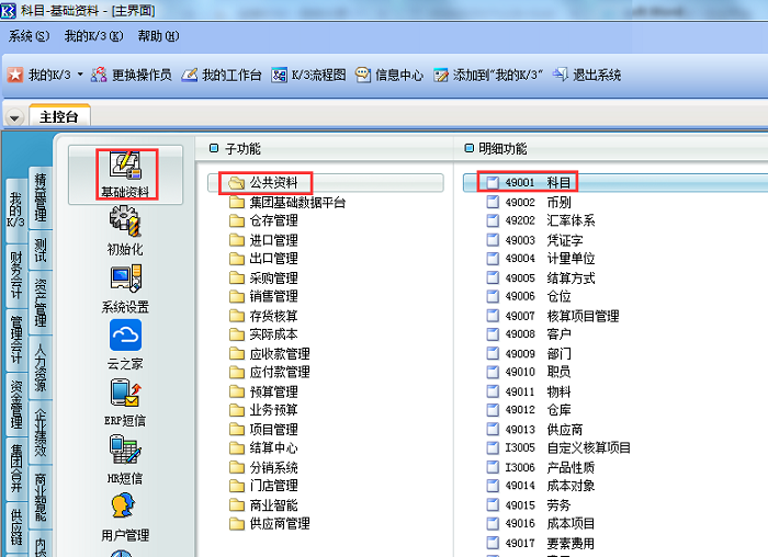 2、依次单击【系统设置】→【基础资料】→【公共资料】,双击打开【科目】,进入科目列表界面;