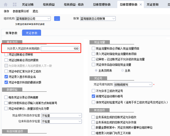 依次打开[财务会计]→[总账]→[参数设置]→[总账管理参数]→[凭证参数],可以看到允许录入未来期间数参数,将此处维护成需要的录入的未来期间数(最大值不能超过100),维护好之后保存参数设置即可正常录入未来期间凭证