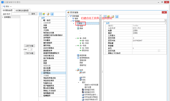 2. 扩展后,点击编辑--批量编辑字段属性--菜单集合,找到工具条右键添加按钮。