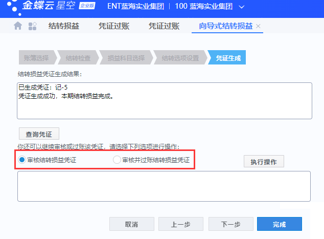 方法二:结转损益如果是通过结转损益向导生成,则在结转损益最后一步,可以选择【审核结转损益凭证】或【审核并过账结转损益凭证】单击【执行操作】即可完成凭证的审核或审核并过账操作。