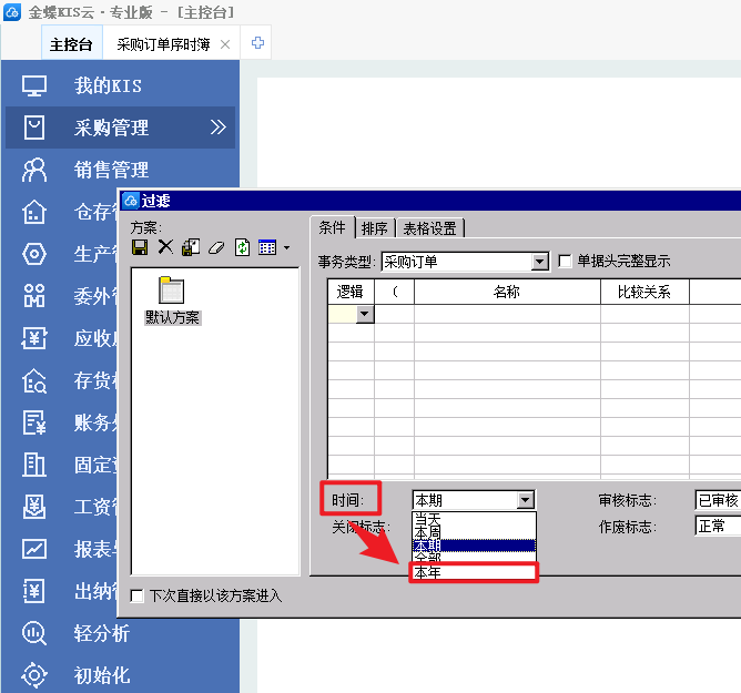 4、在序时簿过滤界面【时间】下拉框增加【本年】选项