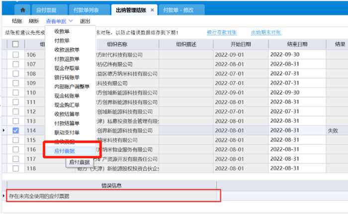 出纳管理结账报错“存在未完全使用的应付票据”