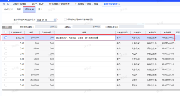 生成的坏账损失单: