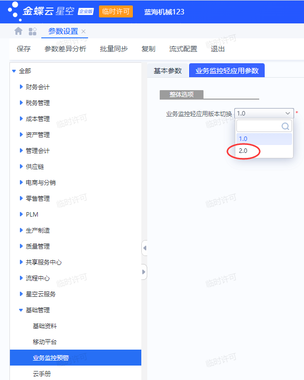 2、然后依次打开【基础管理】-【业务监控预警】-‘业务监控轻应用参数’页面,在‘业务监控轻应用版本切换’这下拉选择2.0,然后点击【保存】即可。