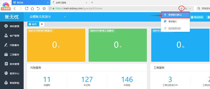 以360极速浏览器为例,进入账无忧系统首页,将浏览器运行模式设置为【极速模式】,再进入账套使用