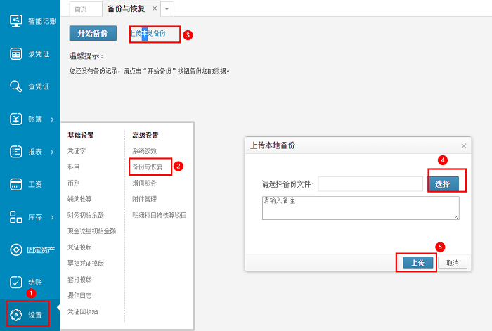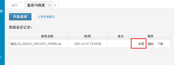 注:恢复操作会覆盖当前账套所有数据,请谨慎操作或者先点【开始备份】后再上传恢复。