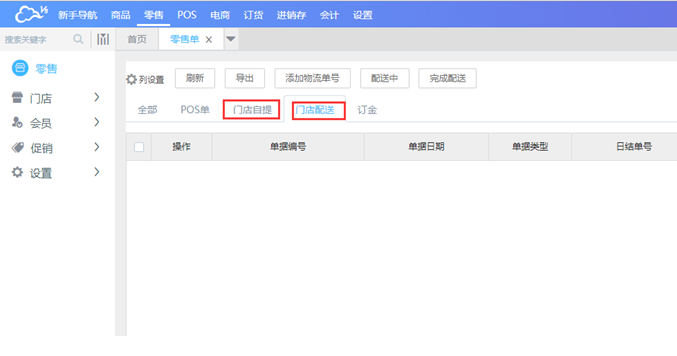 2、门店配送(目前仅微信订货小程序支持门店配送)门店配送目前需要已支付(配微信支付)的单据才可以,如果未支付,点配送时会提示不支持微信小程序下单之后选择不同的配送方式之后,在网页端零售单的界面可以查询到,门店配送界面可以添加物流及单号信息。
