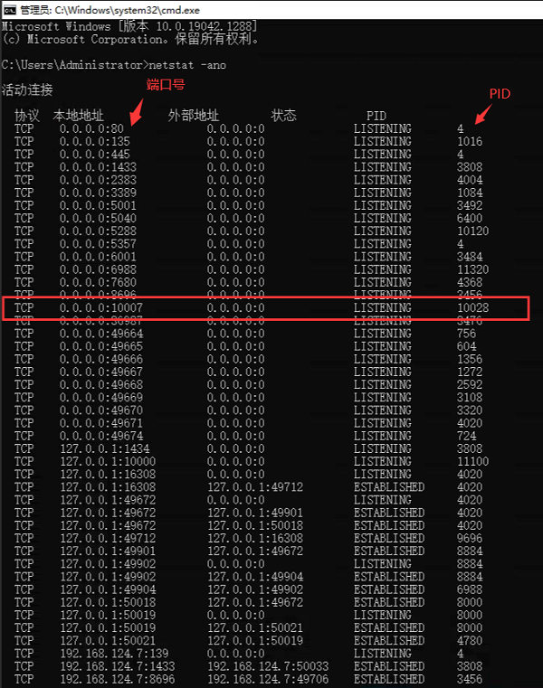 (2)输入netstat -ano,找到10007端口对应的PID;
