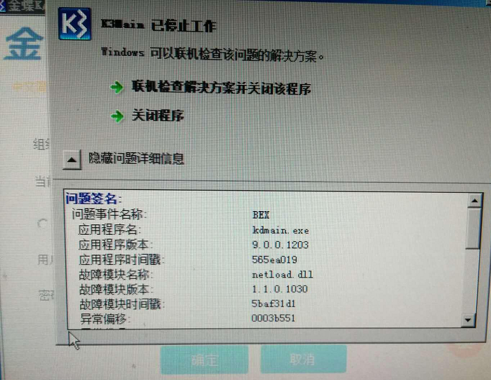 运行K3弹出窗口提示k/3main已停止工作,联机检查解决方案并关闭该程序