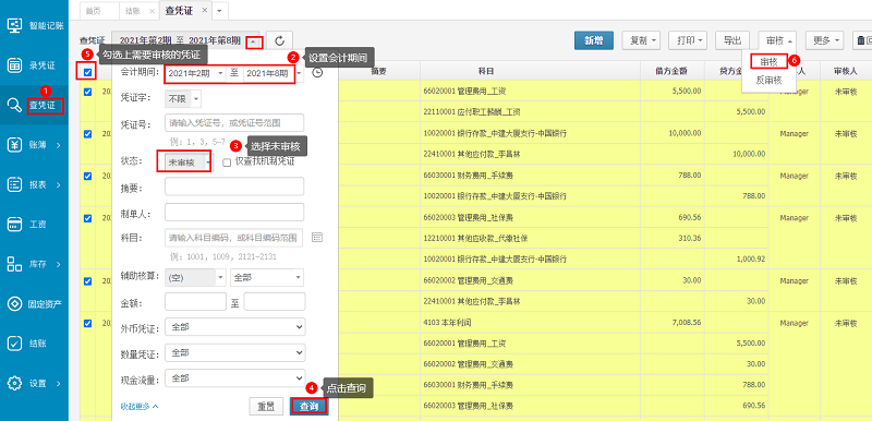 如何快速审核操作账无忧软件中未审核的凭证