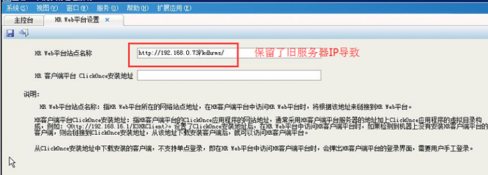 更换服务器后,账套备份恢复到新服务器,系统设置中的HR WEB平台设置,保留了旧服务器信息导致