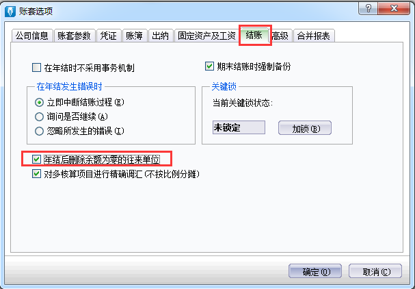 2、单击[高级]-[结账],勾选[年结后删除余额为零的往来单位]参数。