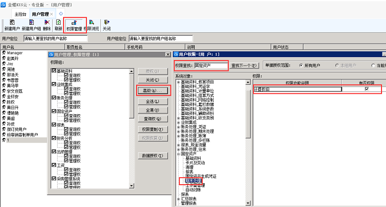 2、选择对应用户,点击【权限管理】,打开【用户管理_权限管理】界面,点击【高级】,在展开的【用户权限-用户】界面,权限查找输入“固定资产”,找到固定资产下的期末处理,将对应“计提折旧”的权限勾选授权即可。
