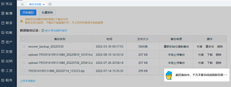 对当前账套内的所有数据进行备份,备份成功后当前数据则保存至当前账套内的服务器上,同时也会在列表内新增一条当前操作的备份文件记录。