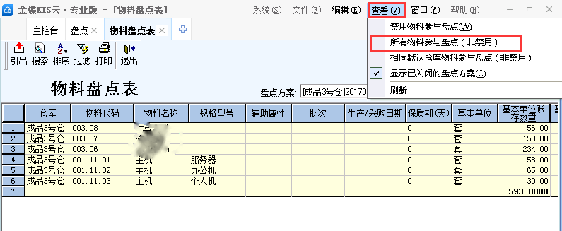 单击[仓存管理]-[盘点]-[盘点方案],选择对应盘点方案,单击左上角工具栏[盘点],再单击右上角菜单栏[查看],勾选“所有物料参与盘点(非禁用)”即可。