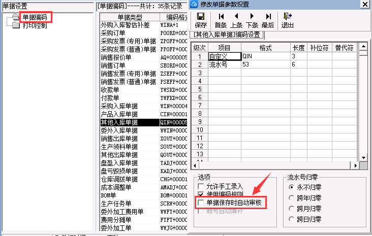 单击[基础设置]-[单据设置]双击打开某单据类型,再点击选项,勾选“单据保存时自动审核”即可。