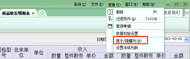 1、 在查看界面点击[查看]-[显示/隐藏列]勾选显示对应字段;