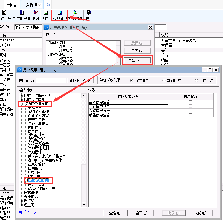 [基础设置]-[用户管理]- 选择对应的用户 -[高级]-[购销存公用设置]-[物料参考信息]权限进行控制即可。