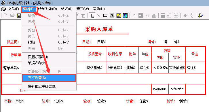 2、单击[编辑]-[套打设置],打开设置窗口;