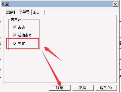 3、单击[表单元]页签,单击选中[表尾],单击[确定]按钮,再保存套打模板即可。