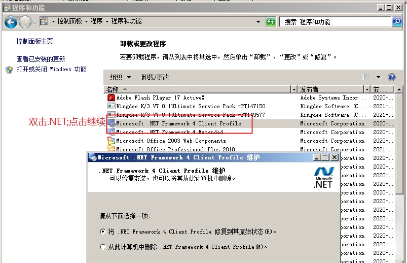在[控制面板] – [程序和功能]中修复.netframework。请见以下截图: