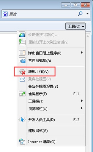 5、 IE8右上角工具里面使用了脱机工作(取消脱机工作的勾选,变成红叉才能正常)