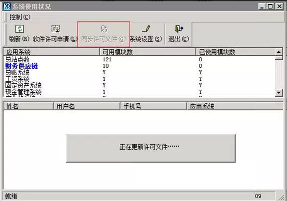 2、登录账套管理后,依次单击 [系统]→[系统使用状况]→[同步许可文件]。