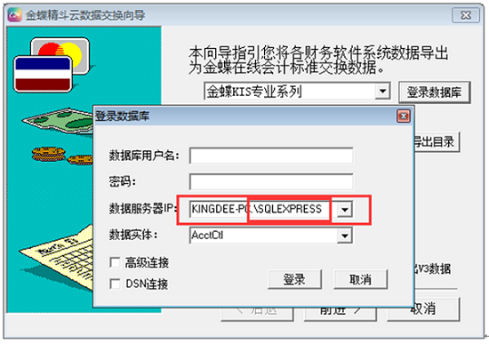 使用第三方转换工具转换kis专业版文件时,如何登陆精斗云数据库?