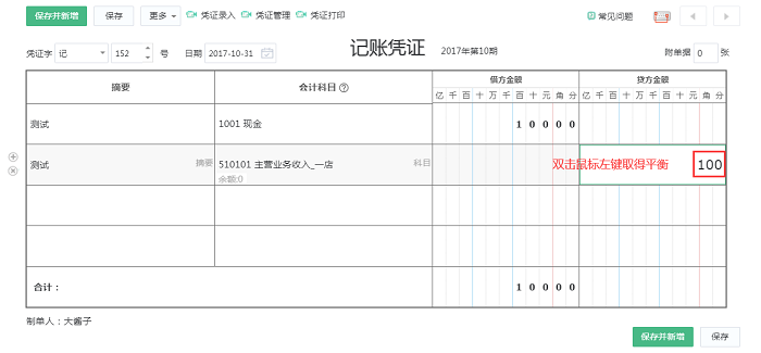 3、在借贷方,双击鼠标左键,获得自动平衡