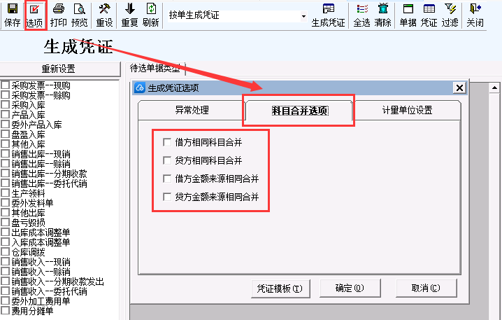 2、单击菜单栏[选项]按钮,打开[生成凭证选项]窗口;