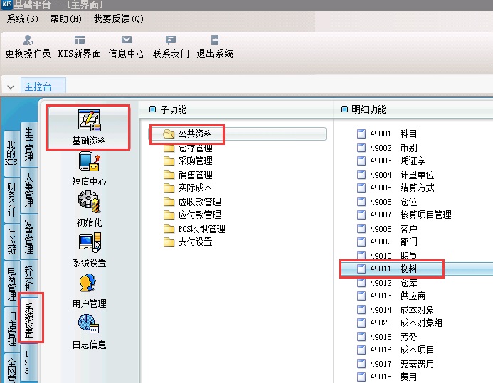 1、主控台界面,点击【系统设置】→【基础资料】→【公共资料】,双击打开明细功能的【物料】,计入基础资料—物料界面;