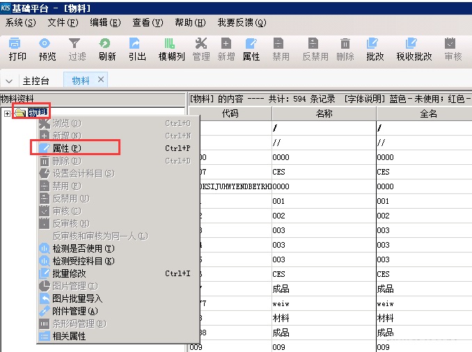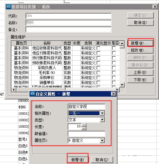 2、鼠标右击物料资料的【物料】,选择点击【属性】,进入【核算项目类别—修改】界面,鼠标左键单击属性维护的【新增】,进入到【自定义属性-新增】界面,维护好对应自定义字段后,左键单击【新增】后回到【核算项目类别—修改】界面点击【确定】即可。