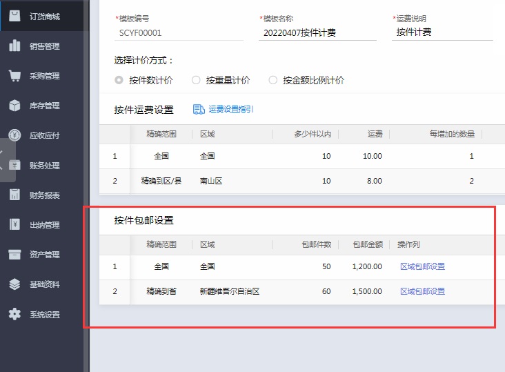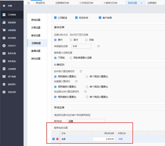 金蝶云星辰,订货商城参数的整单包邮设置与运费模板中包邮设置如何运用?