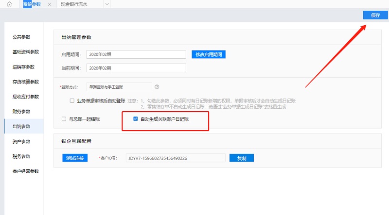 需要在【出纳参数】里面勾选“自动生成关联账户日记账”保存参数,然后重新查看新增界面可以查看到