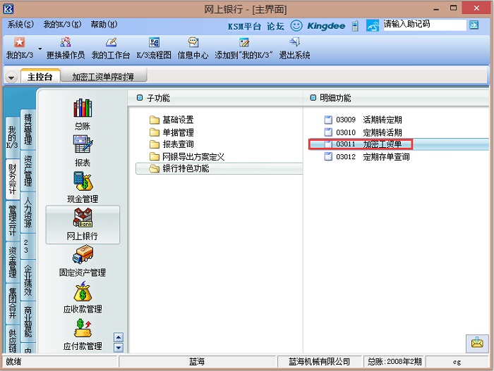 1、登录K/3主控台后,依次单击[财务会计]→[网上银行]→[银行特色功能],双击打开明细功能[加密工资单];