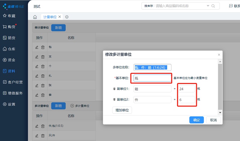 金蝶小K:首先,我们需要现在【资料】-【计量单位】中设置商品需要使用的多单位,例如:一件饮料是6瓶,一箱饮料是24瓶,设置方式如下图所示,设置好基本单位和换算率即可。