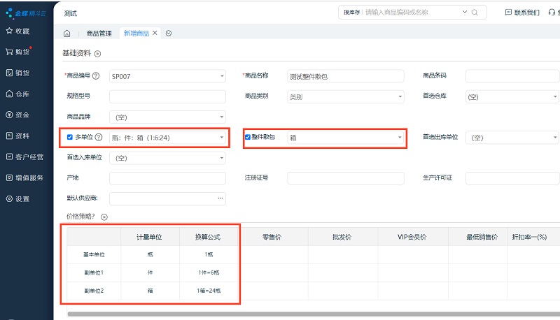 其次,在【商品管理】界面,先勾选【多单位】,开启多单位后,右侧会自动出现【整件散包】功能,需要勾选启用,启用整件散包后,系统会自动带出换算公式。在价格策略中录入对应单位的价格时,系统也会自动按照折算率进行自动填列。