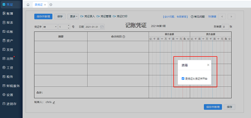 精斗云录入凭证如何设置从凭证字开始录入
