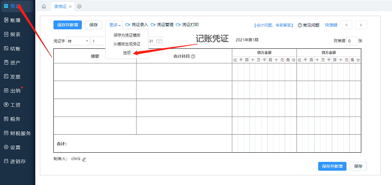 【录凭证】-【更多】-【选项】