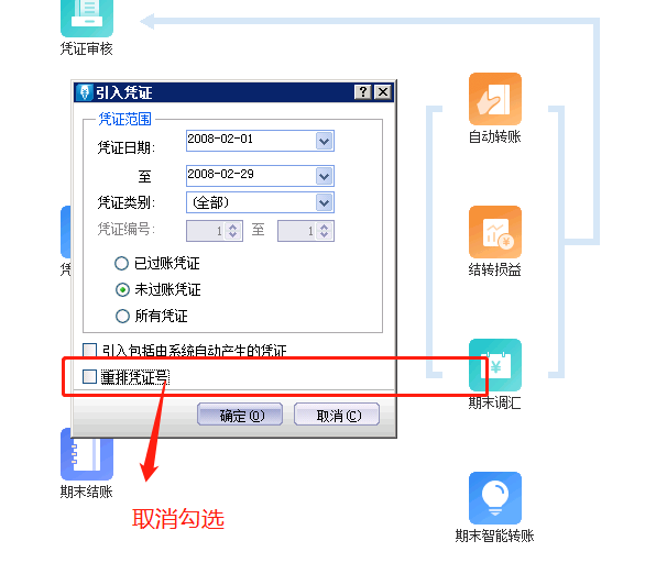 引入凭证界面重排凭证号参数不勾选即可。
