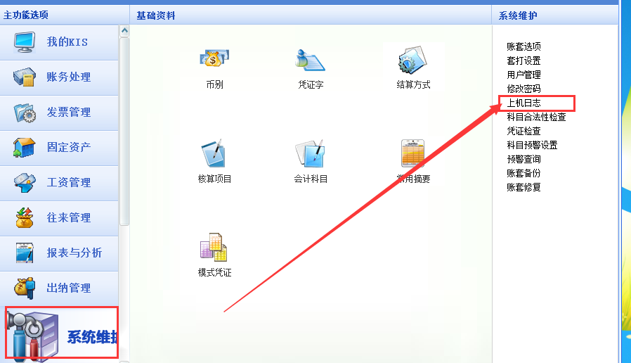 单击[系统维护]-[上机日志]查询。